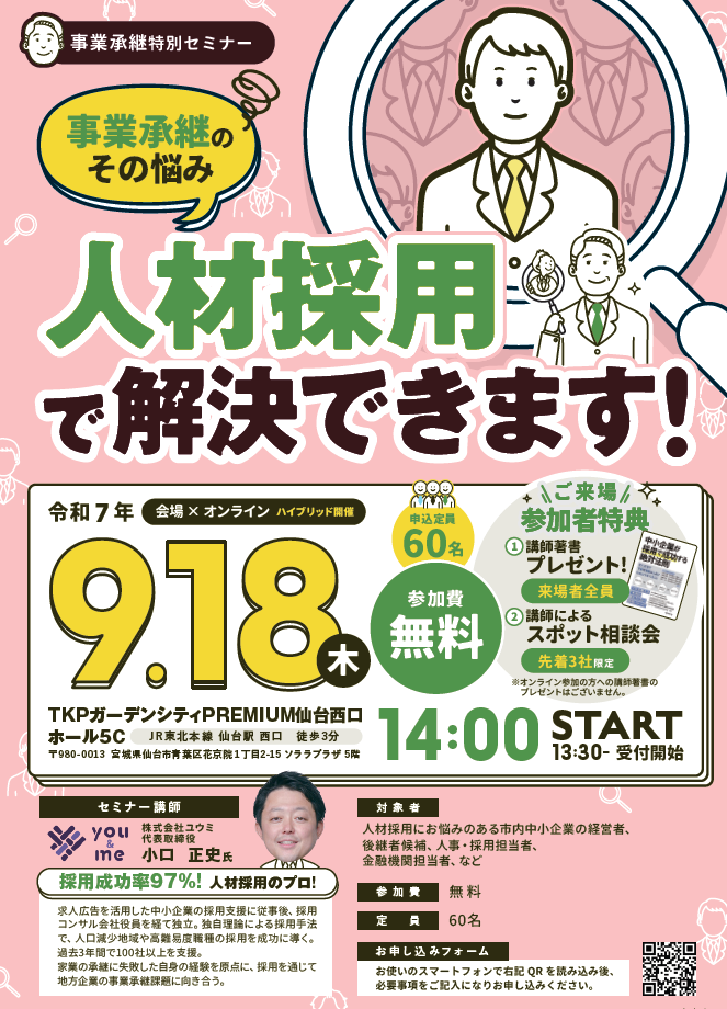 ◆対象:市内中小企業の経営者、後継者候補、人事・採用担当者、金融機関担当者など
