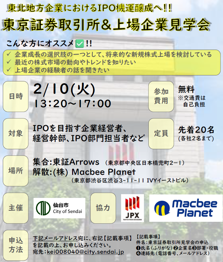 今回、東北地方のIPO機運を醸成するために、㈱東京証券取引所様と㈱Macbee Planet様にご協力いただき、見学会・意見交換を行う機会をいただけることになりました。