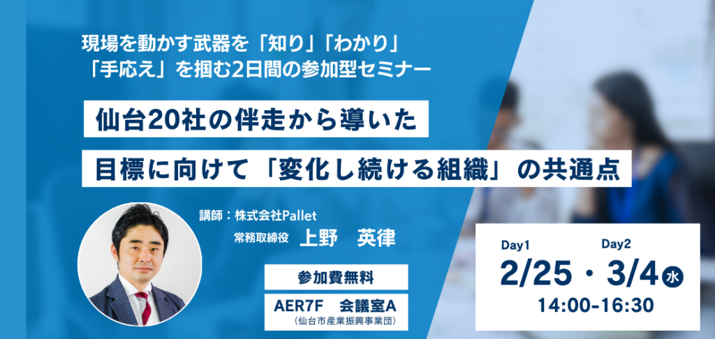 仙台市産業振興事業団主催のもと、株式会社Pallete 常務取締役の上野様を講師にお迎えし、組織開発に関するセミナーを開催いたします。本セミナーは、仙台市にける20社を2年間伴走した実践知をもとに、組織を動かす「関わり方」を体感的に身につけることが出来る参加型セミナーです。組織に課題を感じている方や組織を本気で変えたい方は是非ご参加ください。