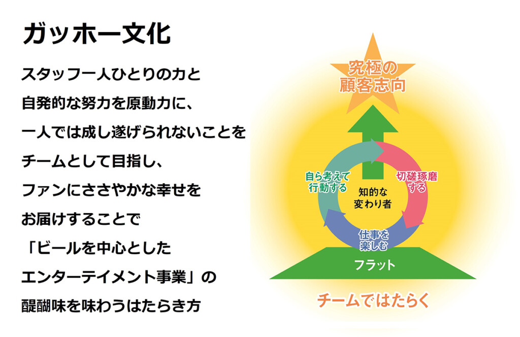 「ガッホー文化」とは、私たちの仕事の仕方や職場環境のあるべき姿を明文化したもので、全スタッフ間で共有しています。「ビールに味を!人生に幸せを!」というミッションで会社の方針を確かめ、ビジョンで現在目指すべき方向を定め、「ガッホー文化」に基づいて日々の具体的な業務に望むのがヤッホー流の組織づくり。スタッフの採用時にもミッション、ビジョン、ガッホー文化の考え方との相性を選考基準にしています。