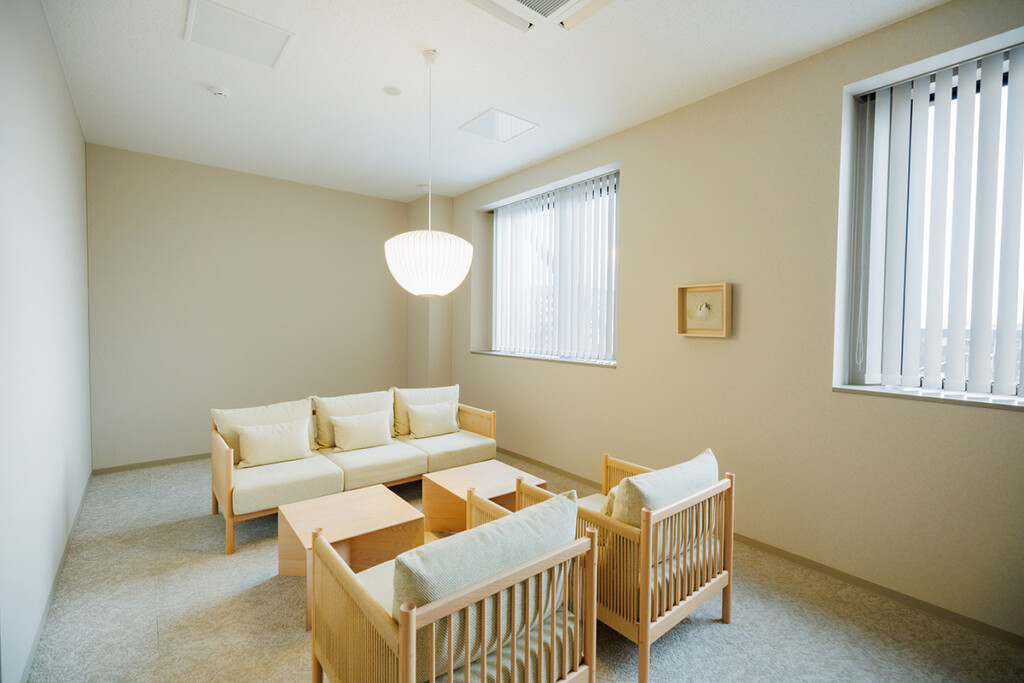 応接室。天然素材を生かした洗練されたインテリアも環境改善の一環。